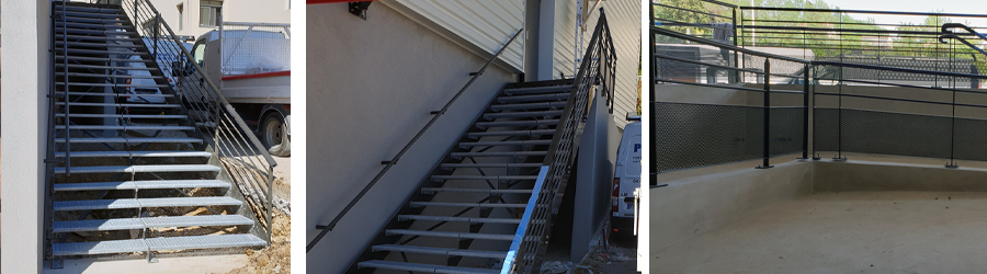 Notre équipe a installé un escalier type « issue de secours », 2 unités de passage, en acier galvanisé & peinture époxy, d’une hauteur de 4m avec garde-corps barreaudé, ainsi que notre main courante MAK-ROHAND.