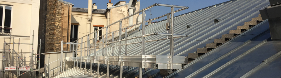 Sécurisation d’une toiture par la pose d’une passerelle, de 13m de long, tout en aluminium. Passerelle fixée sur l’ossature bois de la couverture traditionnelle en zinc. Pose d’emmarchements en tôle larmée et de lignes de vie inclinées pour circuler entre les pans.