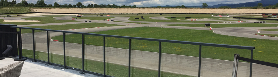 Pose de garde-corps publics en aluminium avec remplissage en verre répondant à la norme NF P 01-012 sur la terrasse d’un karting.