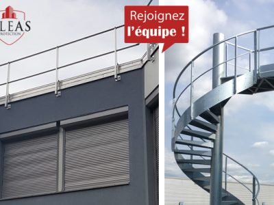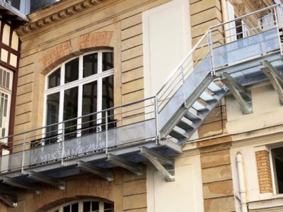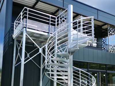 Notre équipe a installé un escalier type « issue de secours », 2 unités de passage, en acier galvanisé & peinture époxy, d’une hauteur de 4m avec garde-corps barreaudé, ainsi que notre main courante MAK-ROHAND.